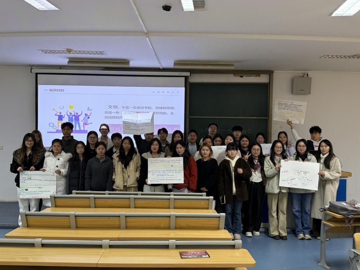 实践环节,各班级引导学生“找问题、想办法、定承诺”,针对“自行车乱停乱放”“网络谣言传播”“教室长期占座”等突出问题,提出“设置校园交通引导标识”“建立网络文明倡议书”“推行教室座位预约机制”等可操作方案。2024级研究生一班汇总形成文明行动共识,本科生班级界定“理性批评与情绪化宣泄边界”,让文明教育从“纸上谈兵”变为实际行动,推动行为共识从分散走向统一,形成覆盖学习、生活、网络的具体规范。